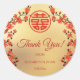 Boda chino le agradece a su pegatina con un símbolo rojo doble de felicidad y flores rojas de cerezo en un fondo dorado. Sus sentidas palabras de "Gracias" están escritas en un elegante guión clásico, nombres de novias y novios y la fecha de boda en un clásico tipo de letra serif.