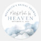 Pegatina para Despedida de Soltera "Match Made In Heaven". Una pegatina redonda encantadora y elegante diseñada para agregar un toque pulido a tu celebración. Curvado alrededor del borde, el texto dice "Despedida de Soltera de Nombre" en fuentes serif azules clásicas, creando un marco atemporal para el diseño.