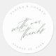 Elegante guión escrito a mano 'con nuestro agradecimiento' en un sencillo pero impactante pegatina de favores mostrado aquí que también muestra sus nombres y fecha boda en verde sabio sobre blanco. Busque ID954 para ver otros productos y opciones de color para este conjunto de bodas.