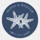 Estos stickers de bodas costeras azul marino presentan dos estrellas de mar rodeadas en la parte superior e inferior con los nombres de la novia y el novio y la fecha boda. Consulte la colección de la suite de invitados de boda coincidente y más productos coincidentes.