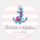 Diseño de pegatinas de bodas náuticas con ancla con flores sobre fondo de rayas rosas.
