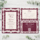 Captura la esencia del romance atemporal con este elegante diseño de boda de encaje borgoña. Ya sea que estés planeando una ceremonia Victoriana oscura o una celebración de otoño rústica y chic, el fondo rojo intenso (Marsala) y el delicado borde de encaje floral de color crema ofrecen una apariencia lujosa y de alto contraste.