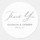 Elegantes pegatinas de bodas mostrando "Gracias" en un hermoso guión de caligrafía negra con fondo blanco con sutiles especkles negros. Personaliza a los pegatinas de agradecimiento modernos con tus nombres y fecha de boda. El boda afilado gracias a los pegatinas es perfecto para sellar sobres de tarjetas, bolsos de favores de boda, etc.