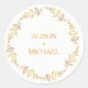 Arroz dorada acuarela y laurel bronceado deja pegatina de corona boda con sus nombres / texto sobre fondo blanco. Ideal para una moda elegante otoño en bodas rústicas al aire libre de campo.
