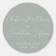 Este evento o pegatina boda moderno y elegante presenta un sencillo eucalipto de fondo verde con texto blanco. Los nombres de la pareja se imprimen en una letra de guión. A continuación se indican la fecha y la ubicación del boda.