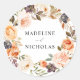 Elegantes etiquetas de boda florales de otoño para invitaciones de boda y/o favores con una corona de flores acuarelas, suculentos y hojas en tonos rosas, melocotones, naranjas, crema, marrón y verde. Personalice los stickers rústicos de boda floral añadiendo sus nombres. Diseñado para coordinar con nuestra colección de bodas acuarelas Rustic Fall Floral.