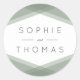 Este moderno pegatina boda presenta un diseño geométrico en capas verde sabio en la parte delantera con los nombres de la pareja boda. Personalízalo reemplazando el texto del marcador de posición. Para obtener más opciones como cambiar el tipo de letra, su tamaño y espaciado entre letras haga clic en el botón "Personalizar". *Tenga en cuenta que la marca de agua Zazzle que aparece en la vista previa del zoom NO aparecerá en el producto impreso final. © Rosewood y Citrus