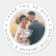 Este boda gracias pegatina presenta marcos de círculo gris con una foto y una simple caligrafía.
