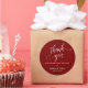 Moderno Boda Minimalista Gracias Regalos Clásicos Pegatina Redondo, en escritura elegante, corazón rojo, con firma de novios y novios y fecha boda, vino de borgoña tema rojo profundo.