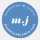 Moderno y mínimo pegatinas de sitios web de estilo retro azul negrita, nombre personalizado, monograma y boda de la pareja. El diseño presenta un diseño de texto en arco con el monograma de la pareja mostrado en gran negrita.