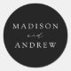 Selle sus sobres de invitación o favores con nuestros elegantes pegatinas de boda. Los pegatinas de boda personalizados presentan sus nombres en un guión de caligrafía blanca con un fondo blanco y negro. Diseñar coordenadas con nuestra colección de bodas Modern Elegance.