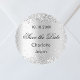 A Guardar el pegatina de fecha para su boda. Un fondo falso de aspecto plateado, texto negro. Decorado con confeti. Personalice y agregue sus nombres y fecha de boda.