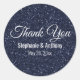 Boda purpurina azul marino falso, gracias etiqueta. El diseño presenta una moderna textura de purpurina azul marino, el texto "Gracias", los nombres de la novia y el novio y la fecha del boda.