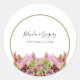 Este diseño presenta un ramo rústico de flores silvestres. Un marco simple de círculo dorado rodea el texto. Los tonos rústicos de color rosa y floral completan la vegetación de las hojas. Los tonos dorados lo unen todo para crear un ambiente rústico y campestre en el jardín de bosques. Las rayas doradas y rosas cubren la parte posterior del diseño. Elegante diseño pegatina de bodas con elementos modernos. También hay disponibles invitaciones de boda coincidentes y otros artículos de papelería.