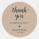 Moderno Boda rústico Gracias Regalos Clásicos Pegatina Redondo, en escritura limpia, pequeño corazón rojo lindo, con firma de novios y novios y fecha boda, tema de kraft marrón de cabaña.