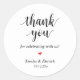 Moderno Boda rústico Gracias Regalos Clásicos Pegatina Redondo, en escritura limpia, pequeño corazón rojo lindo, con la firma de novios y novios y fecha boda, tema blanco y negro.