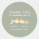 Elegante pegatina de bodas verde sabio y polvoriento que presenta pájaros amantes del oro y un dulce mensaje de "Gracias por celebrar con nosotros". Personalizado con los nombres de la pareja y la fecha de boda, este pegatina redondo es perfecto para sellar sobres, decorar bolsos de bienvenida o añadir un toque romántico a la decoración de la recepción. Coordina con la suite boda completa.
