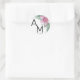Pegatina redonda clásica de monograma de boda floral tropical con acuarela moderna. Un diseño tropical que abraza la belleza tranquila de la naturaleza mezclada con un toque juguetón que seguramente te ayudará a divertirte. Una mezcla de calmantes hojas tropicales verdes y flores de orquídea púrpura-rosadas que se apaciguan con otro follaje verde diverso. Mejorado por una fuente manuscrita moderna, esta impresión encantadora irradia encanto y sofisticación. Este diseño versátil trae un sentido de paraíso tropical a cualquier entorno u ocasión especial, lo que lo hace perfecto para una boda de destino, o simplemente cuando quieres agregar un toque tropical.