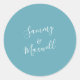 Estos stickers de boda muestran el nombre de la novia y del novio en un estilo de letra moderno con letras a mano sobre un sólido color azul turquesa. Utilícelos para sellos para sobres bodas o favores partidarios. Para ver los elementos coincidentes de Victoria Grigaliunas visita DoTellABelle en Zazzle en www.zazzle.com/dotellabelle