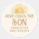Este pegatina de ducha de bebé con temática solar presenta el texto "Here Comes The Son" en una tipografía elegante con un bonito sol de color amarillo acuático sobre un suave fondo crema. Personalizable fácil. Acuarela original © Michele Davies.