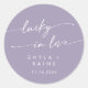 Esta moda boho lavanda morada con suerte en el amor favorece al pegatina redondo clásico es perfecto para un boda minimalista. El colorido y polvoriento diseño bohemio moderno presenta una caligrafía rústica sencilla con un estilo único y clásico. Personalice a sus pegatinas favoritos con sus nombres y fecha de boda.