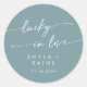Este verde azulada de moda boho, con suerte en el amor, favorece al pegatina redondo clásico, es perfecto para un boda minimalista. El moderno diseño bohemio azul verde y colorido presenta una caligrafía rústica sencilla con un estilo único y clásico que recuerda a la playa, el océano y la costa de verano. Personalice a sus pegatinas favoritos con sus nombres y fecha de boda.