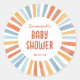 Bienvenidos a su pequeño rayo de sol con este Pegatina Boho Sunshine Gender Neutral Baby Shower Round que presenta un adorable sol de color amarillo, oro, naranja, azul y melocotón.