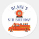 Con el ilustracion original de Popobell de un motor de bomberos rojo clásico y una alarma de incendios.