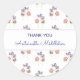 Selle su regalo o sobre con un pegatina de agradecimiento personalizado. Mano pintaba guisantes dulces en rosa y lavanda. Personalizar fácilmente el nombre mediante la función "Personalizar esta plantilla" de Zazzle. Las palabras "Gracias" y el nombre personalizado se sientan sobre un panel blanco con borde rosa con un fondo de guisantes dulces en un patrón repetido.
