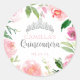 Pegatina Redonda Bonito Floral Quinceañera Plata Tiara Fiesta