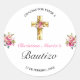 Pegatina Redonda Bonito Rosa Floral Oro Cruz Bautismo Gracias