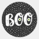 Agrega un toque personalizado a tu fiesta de Halloween con lindos pegatinas de Boo Halloween. ¡Los pegatinas tienen puntos blancos, un fondo negro y la palabra "Boo" completa con ojos monstruo! Los pegatinas de Halloween son perfectos para ser usados como favores y sellos para sobres de fiesta.