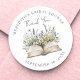 A sweet and elegant round sticker inspired by the “A New Chapter Begins” theme, perfect for baby or bridal showers. The design features “Thank You” centered at the top in a handwritten script, placed above a watercolor illustration of an open vintage book. From the pages, delicate wildflowers and greenery bloom in a soft mix of blush pink, purple, yellow, blue, and green, creating a romantic, whimsical, storybook feel.