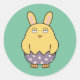 Una chica gordita, sin impresionar, vestida como conejito, mitad dentro de un huevo decorado—La Pascua nunca se ha visto tan aburrida!