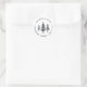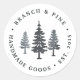 Los pegatinas de moda rústica para su negocio al aire libre, aventurero o natural cuentan con un trío de pinos azules y grises con dos campos de texto personalizado en un diseño circular curvo.