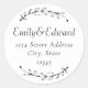 Custom-designed circular wedding return address labels featuring elegant hand-drawn laurel wreath. Personalize with couple/bride and groom's names and address. Perfect for adding a touch of style to wedding envelopes, gifts, favors, new home announcements, and more!