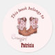 Personaliza el primer nombre de tu hijo en esta calcomanía de botas de vaquera rosadas y marrones sobre fondo rosa pastel. Esta calcomanía con tema western es para que las niñas la pongan en sus libros o en sus útiles escolares, para que nada se pierda. O cualquier otro artículo preciado para tu niña.