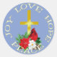Este es un pegatina para uso versátil durante la temporada de vacaciones, y lleva el verdadero significado de los Navidades. Cuenta con una cruz de oro con un hermoso ramo de Navidades a los pies. Flores de cinsettia, vegetación y un cardenal rojo alegran el ramo. La imagen está rodeada por el texto Love Hope Peace Joy en blanco, alineado en oro, y colocado sobre un fondo azul.