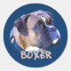 El diseño de un perro Boxer de gran tamaño de la cabeza de un perro Boxer con el texto estilizado de Boxer escrito debajo.
