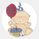 Camisetas de primer cumpleaños, bodysuit, botones, imanes, tazas y más con un adorable bebé en un gorra fiesta y un globo que dice "¡Mira quién es uno!".