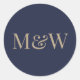 Sello Pegatina Boda de Iniciales de Oro y Marina Modernas. Hermoso diseño marino y dorado con tipografía moderna e iniciales de la pareja. Texto de color oro antiguo sobre azul. Personaliza con las iniciales de la novia y el novio. Excelente para sellos para sobres y favores. Visita nuestra tienda, Austen & Grace, para ver la suite boda completa, productos a juego y más, y por favor contáctanos si necesitas ayuda contact@austenandgrace.com