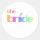 El texto de los colores del arcoiris que dice "La novia" aparece en camisetas de novias, tazas, botones, tarjetas, imanes, cadenas de claves y otros artículos para novias.