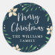 Selle sus regalos navideños o envíos por correo de la temporada navideña con estos pegatinas redondos festivos que presentan "Feliz Navidad" y su nombre familiar o nombres con letras blancas en un fondo azul medianoche, rodeados de flores de poinsettia blanca y follaje botánico color agua verde.