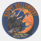 Estos brillantes pegatinas redondos presentan la moderna actualización retro de Leslie Sigal Javorek a una divertida imagen de Halloween de los años 50 de una bruja riéndose lanzando los pelos de un hombre sonriente en la luna. Encima de ellos está el saludo "Halloween feliz" en una letra con forma de hueso naranja y todo en un fondo azul medianoche. El título de Punny (divertido+juego de palabras) en la parte inferior "& Witching You Moony More!" se puede mantener, personalizar o borrar.