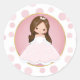 Este diseño presenta una princesa de cabello marrón lindo con vestido rosa, corona y guantes sobre un fondo de punto rosa muy lindo.