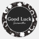 Buena suerte pegatina con diseño de patrón de suerte negro y blanco con cuatro trébol de hojas, shamrock, herradura, dados, ocho bolas. Cuentan con un lindo texto y una imagen personalizables. Perfecto para invitaciones y golosinas de bolsos fiestas.