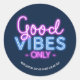 Las Buenas Vibes Sólo Neon Rótulo Divertido Personalizado Clásico Pegatina Redondo. Diseño divertido y positivo con un cartel de neón con el lema "Sólo buenas vibraciones". Muy retro de los años 80. El texto de abajo es personalizable. Borra el texto si no desea una versión personalizada.