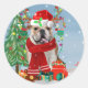 Pegatina Redonda Bulldog inglés en nieve con regalos de Navidades