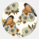 Hand -drawn illustration of a bullfinch bird on bouquet of dahlia, chrysanthemum, berries and branch of autumn leaves.
