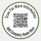 Una imagen de pantalla está en el medio del pegatina. Puede reemplazarlo con su código QR. Hay dos líneas de texto en negro que puede editar para mostrar un mensaje personalizado. (Se muestra: Buscar más información Añadir aquí el nombre de la empresa) Estos pegatinas tienen texto negro en un círculo blanco. El pegatina tiene un borde verde forestal.